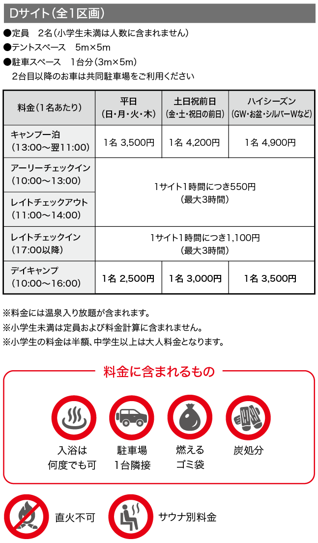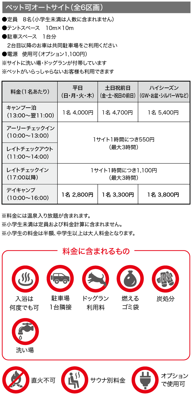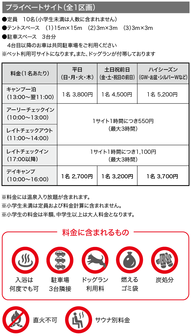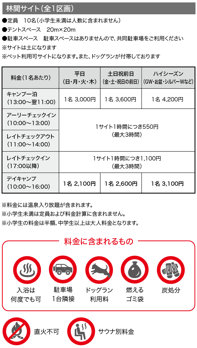 軽食が味わえるカフェ、地元食材を集めた売店、ランタンを始めとしたオリジナルグッズを展開する管理棟。 四季の景色を眺められる温泉、スウェーデン式サウナや沢水を活用した水風呂がある温泉棟。それぞれのスタイルに合わせた18のキャンプサイト。